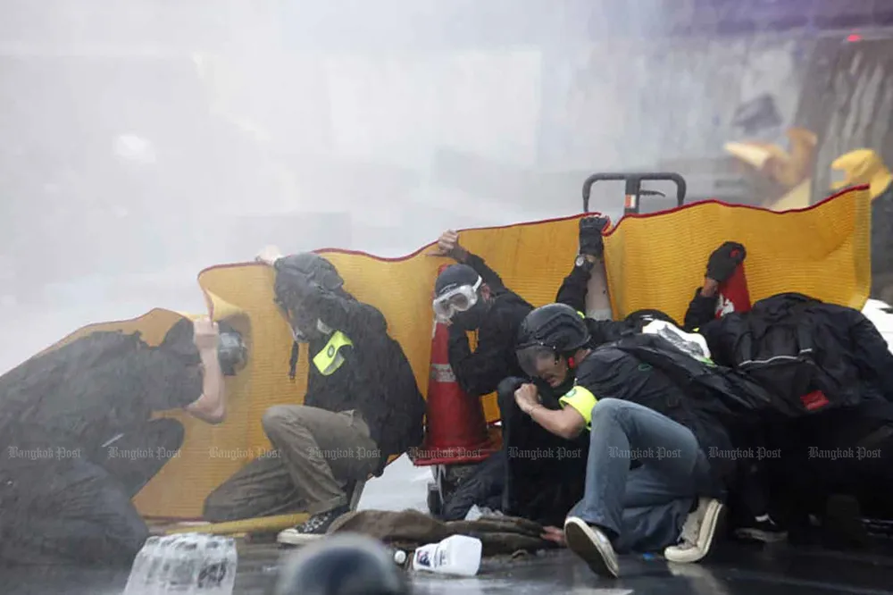Một nhóm người biểu tình đụng độ với cảnh sát chống bạo động gần tòa nhà quốc hội vào tháng 11-2020. Ảnh: BANGKOK POST