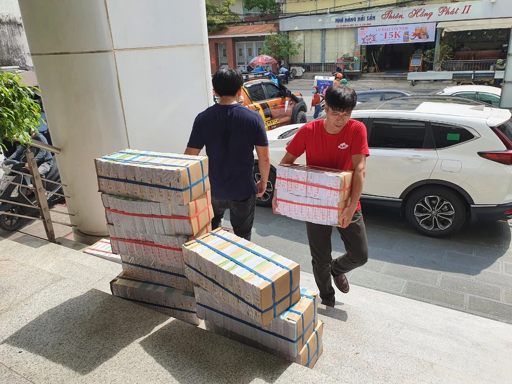 5.000 cuốn tập được Công ty Cổ phần Quang Huy Bakery trao tại trụ sở báo Pháp Luật TP.HCM. Ảnh: HỮU ĐĂNG