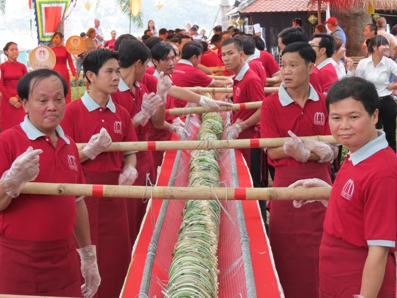 Trước đó, sáng 25 -3 khách sạn Sài Gòn Morin đã huy động nhiều đầu bếp trong khách sạn để hoàn thành chiếc bánh tét trước khu vực tiền sảnh của khách sạn. Chiếc bánh tét được làm từ 5 loại nhân bánh trong đó 5,2m bánh nhân chuối tượng trưng cho kiểu bánh tét miền Nam; 5,2 bánh nhân đậu xanh thịt heo – tượng trưng cho kiểu bánh tét miền Trung; 5,2m bánh tét lá cẩm nhân đậu xanh thịt, đậu phộng nhân đậu xanh thịt heo và lá dứa nhân đậu xanh – tượng trưng cho kiểu bánh tét miền Bắc.