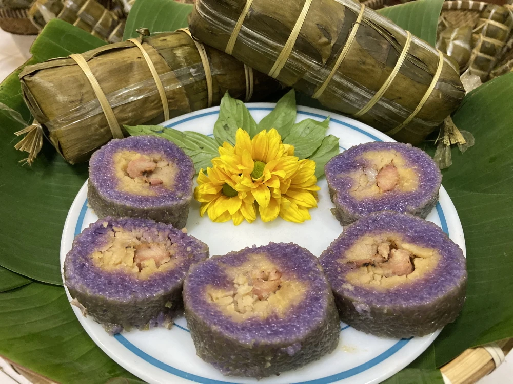 Bánh tét nhân mặn lá cẩm đượm một màu tím ngọt ngào.