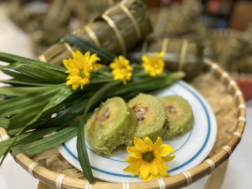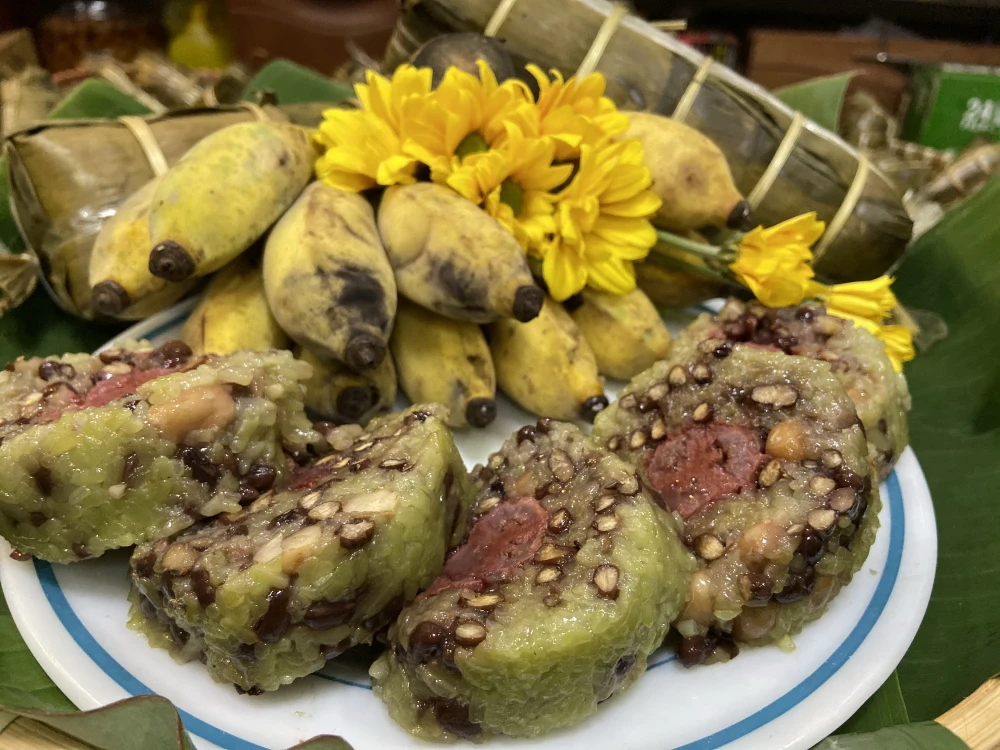 Món bánh tét truyền thống được làm từ nếp cái hoa vàng ngâm với nước tro hòa lá dứa.