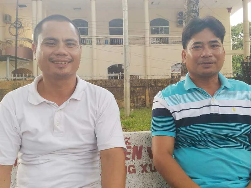 Ông Trần Thanh Toàn (phải)và em trai Trần Minh Vẹn sau phiên tòa phúc thẩm ngày 17-4. Ảnh: N.NAM