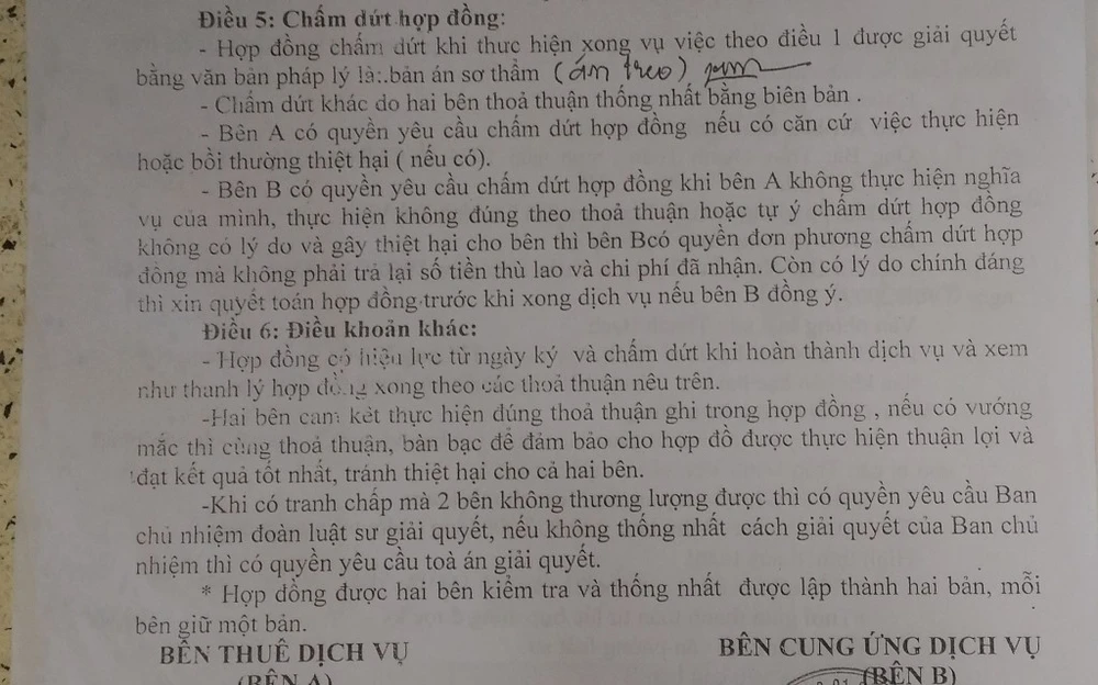 Điều 5 của hợp đồng dịch vụ pháp lý, LS X. đã ghi thêm chữ "án treo" là vi phạm điều cấm của Luật LS. Ảnh: N.NAM