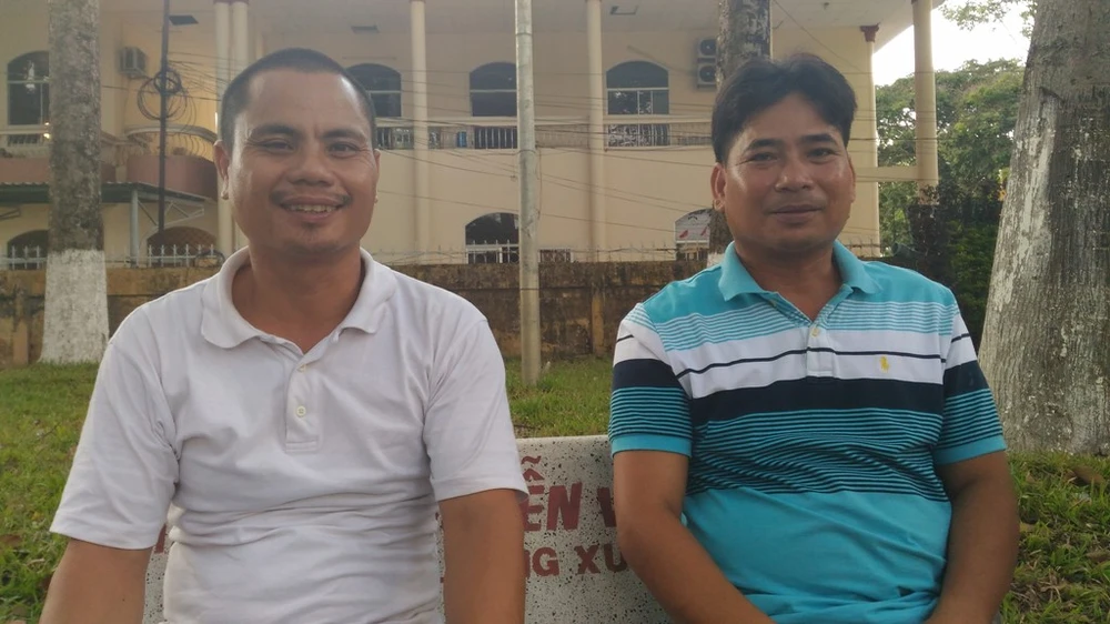 Ông Toàn (bìa phải) và em trai Trần Minh Vẹn sau phiên tòa phúc thẩm ngày 17-4. Ảnh: N.NAM