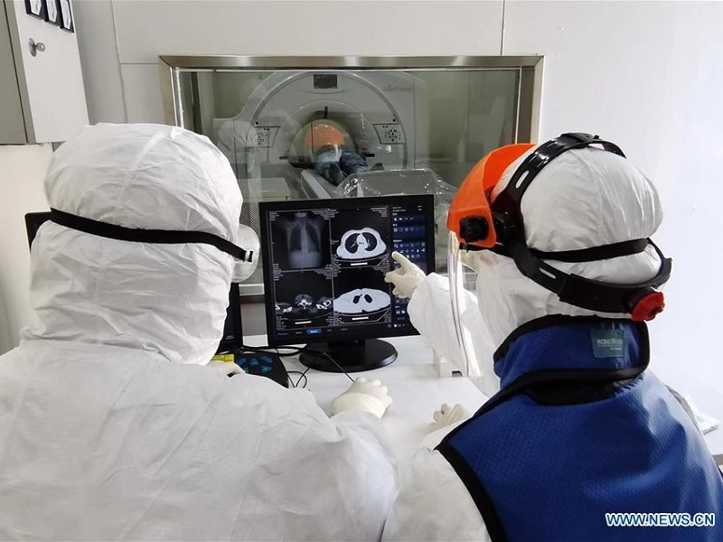 Các bác sĩ đang kiểm tra ảnh chụp CT của một bệnh nhân nhiễm COVID-19. Ảnh: TÂN HOA XÃ