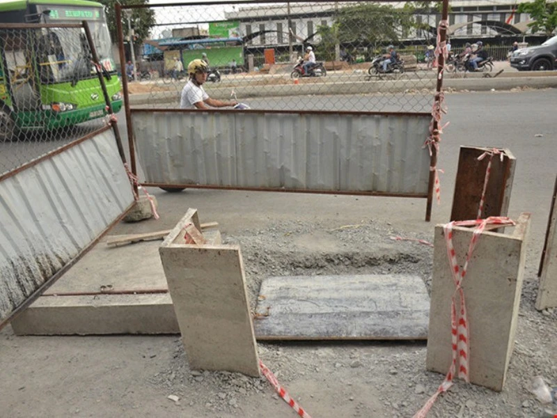 Sau vụ tai nạn chết người, nắp hố ga ở công trình nâng đường Kinh Dương Vương mới được đậy lại. Ảnh: PLO