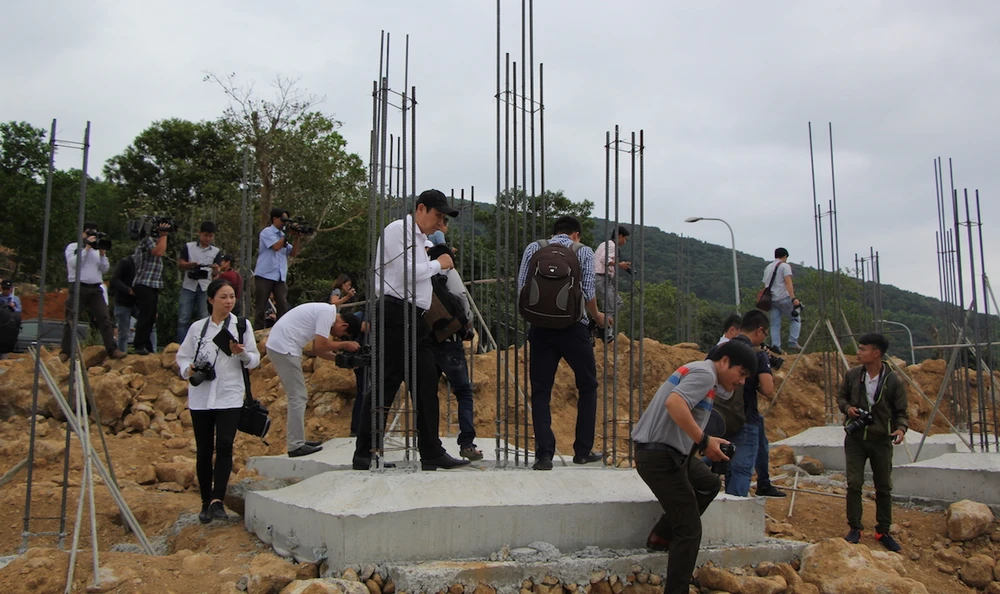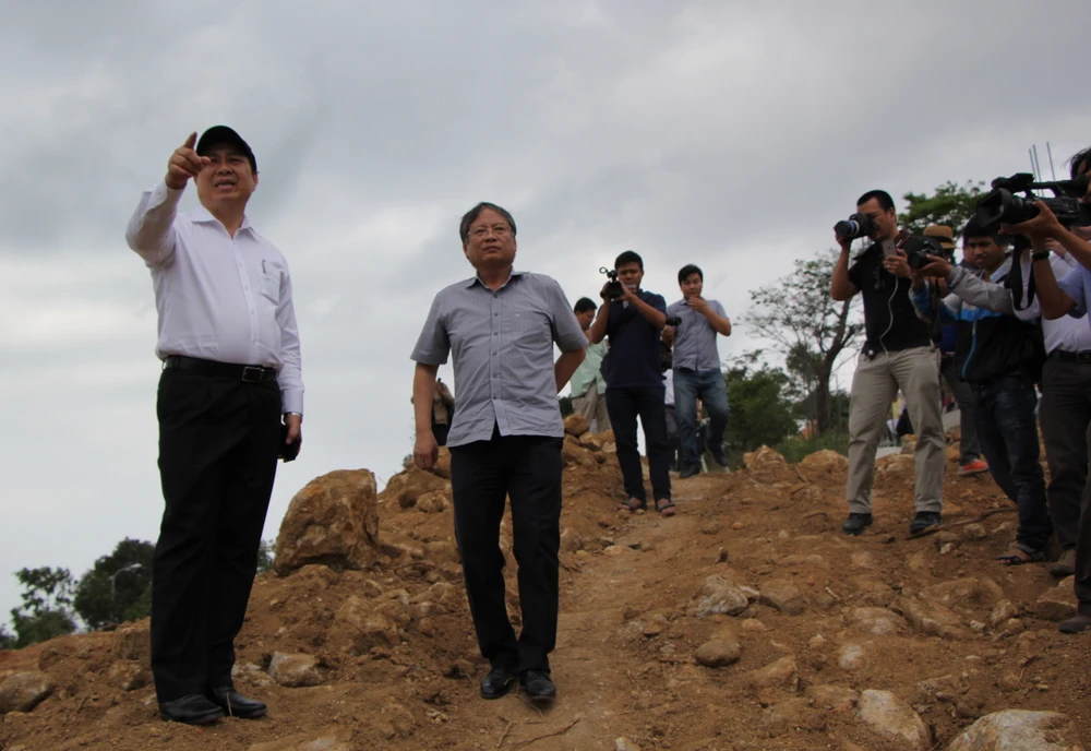 Ông Nguyễn Ngọc Tuấn và Chủ tịch UBND TP Đà Nẵng Huỳnh Đức Thơ trong một lần kiểm tra dự án 40 móng biệt thự trái phép tại Sơn Trà. Ảnh: LÊ PHI