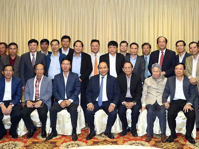 Thủ tướng Nguyễn Xuân Phúc, Ủy viên Bộ Chính trị, Trưởng ban Tuyên giáo Trung ương Võ Văn Thưởng và các đại biểu tại buổi gặp mặt. Ảnh: TTXVN