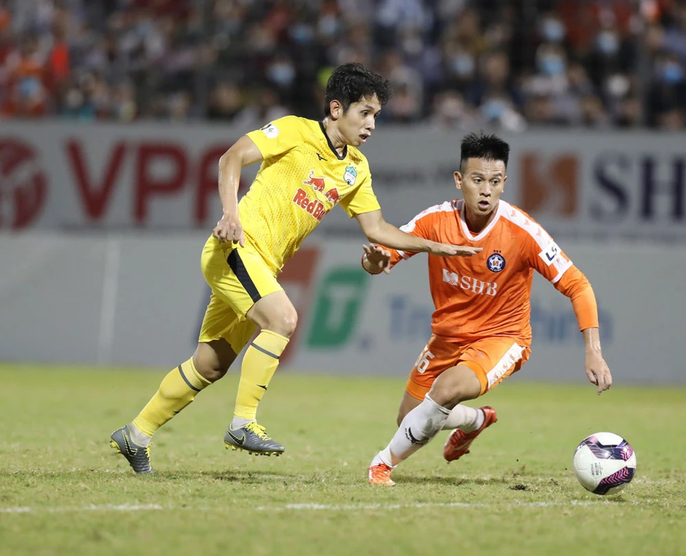 Hồng Duy (vàng) trong trận HA Gia Lai làm khách trước SHB Đà Nẵng. Ảnh: VPF