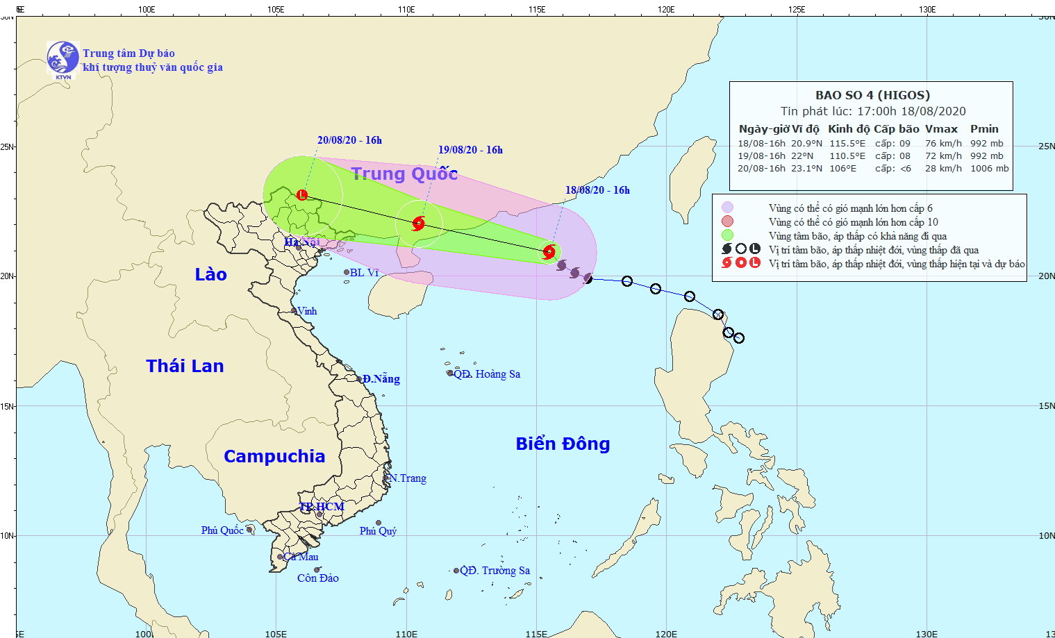 Chiều nay, 18-8, Trung tâm Dự báo Khí tượng thủy văn quốc gia (NCHMF), cho biết bão số 4 đang cách quần đảo Hoàng Sa 570 km. Cường độ bão mạnh cấp 8-9, giật cấp 11.
