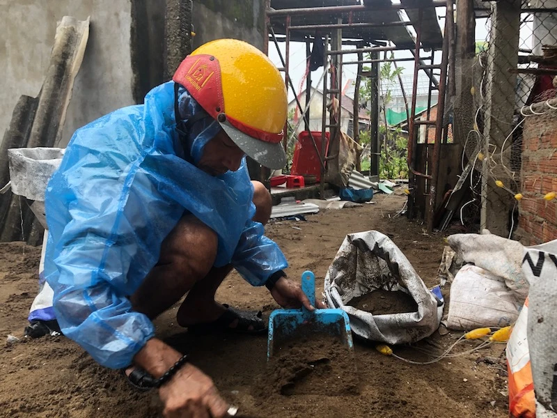 Ông Phiên tất bật đổ cát chằng nhà. Ảnh: THANH NHẬT