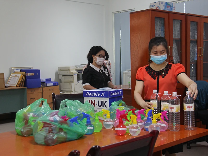 Giáo viên Trường THPT Phan Châu Trinh dọn dẹp, chuẩn bị nước rửa tay đón học sinh trở lại trường. Ảnh: TA
