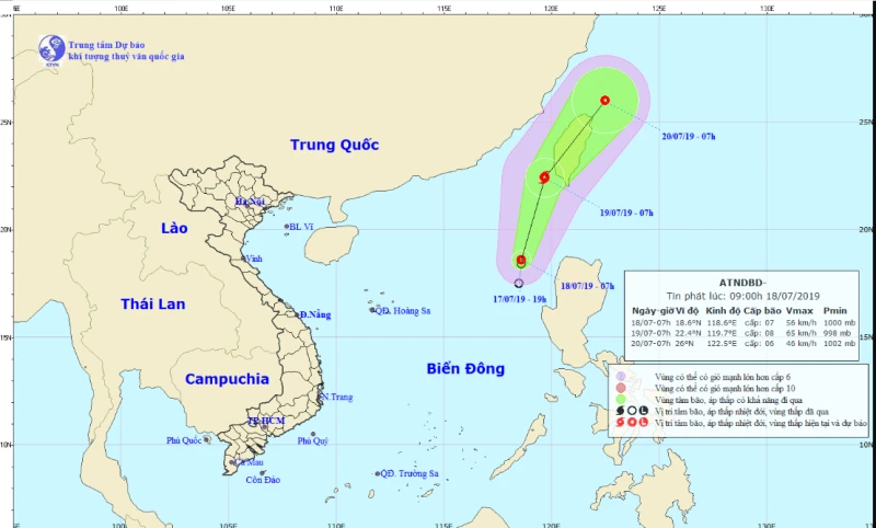 Đến 7 giờ ngày 19-7, vị trí tâm bão trên vùng biển phía Tây Nam Đài Loan. Sức gió mạnh nhất vùng gần tâm bão mạnh cấp 8 (60-75 km/giờ), giật cấp 11.