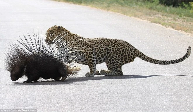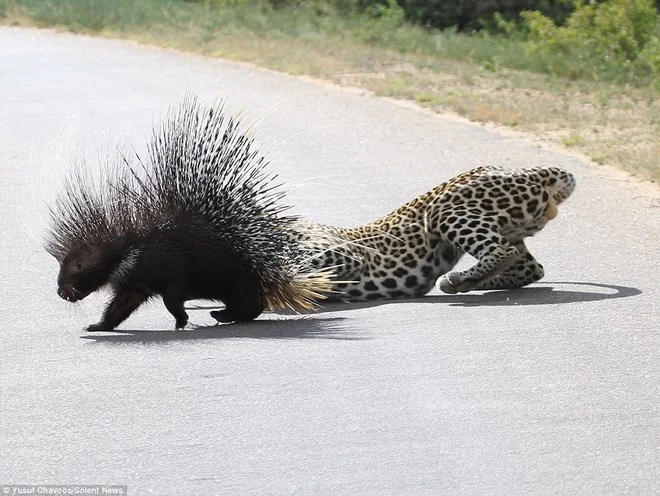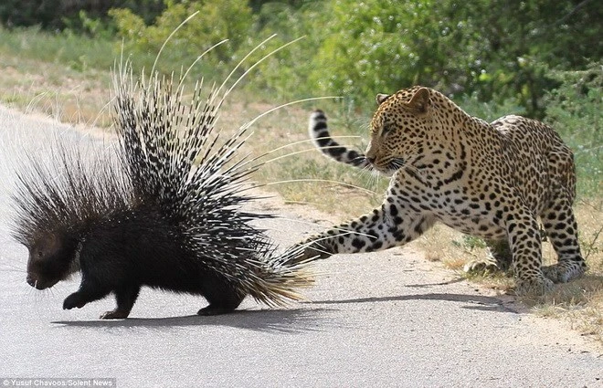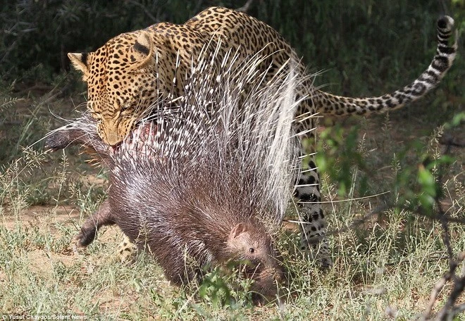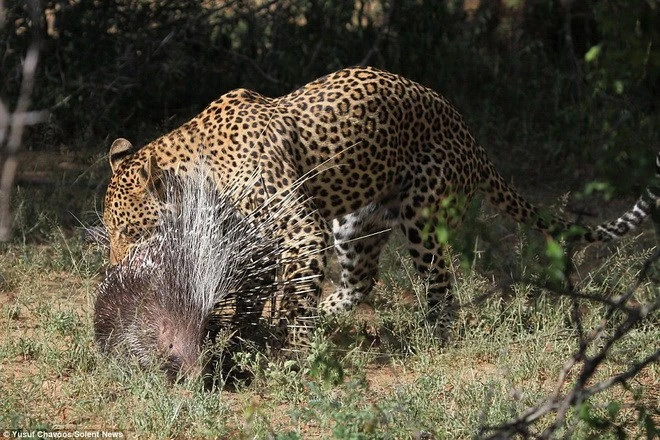 Những cái lông sắc nhọn của con nhím đã khiến chú báo gặp vô vàn khó khăn. (Nguồn: Daily Mail)
