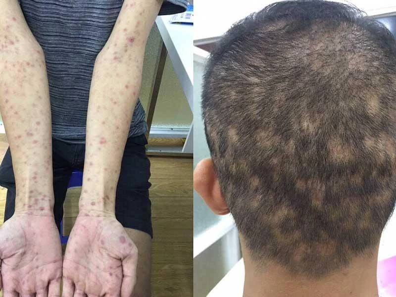 Ở giai đoạn 2, khoảng sau ba tháng đầu mắc bệnh, vi trùng giang mai không còn nằm tại chỗ mà sẽ đi vào máu và phát tán khắp cơ thể, biểu hiện ra toàn thân. Lúc này người bệnh phát ban đỏ cả người ở ngực, thân, tay, mặt…, xuất hiện những vết đỏ tróc vảy, tập trung nhiều ở lòng bàn tay, bàn chân. Ngoài các triệu chứng trên, vùng niêm mạc hậu môn, sinh dục của người bệnh còn có những vết sẩn gồ lên khỏi da, người bệnh có thể viêm họng ở hầu họng, xuất hiện các hạch ở cổ, nách, tóc rụng từng chỏm.