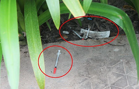 Kim tiêm do các con nghiện vứt đầy các bồn cây ở Công viên 23-9 khiến người dân luôn thấy bất an. Ảnh: HOÀNG TUYẾT