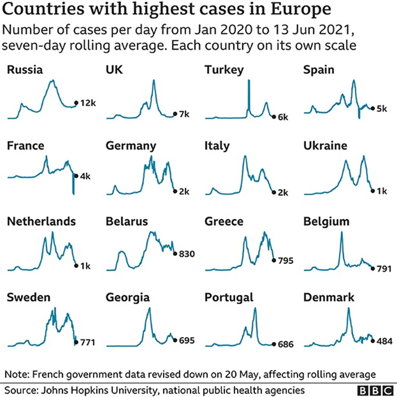Đại dịch COVID-19 đang bùng phát trở lại ở châu Âu, chỉ số ghi nhận các quốc gia, các TP có nhiều ca lây nhiễm nhất là những nơi có diễn ra các trận đấu Euro 2020. Những quốc gia không có những trận Euro có người dân đi du lịch xem Euro cũng tăng lên.