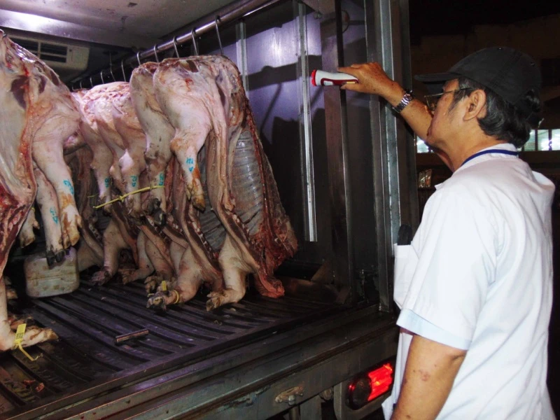 Nhân viên Ban Quản lý an toàn thực phẩm TP.HCM kiểm tra thịt heo từ các tỉnh đưa vào chợ đầu mối Hóc Môn, TP.HCM kinh doanh. Ảnh: TRẦN NGỌC