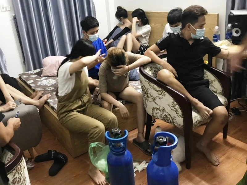 Tại đây, công an phát hiện 11 thanh thiếu niên đang tụ tập ăn nhậu và hút bóng cười. Nhóm này gồm 6 nam, 5 nữ có tuổi từ 17-29 trú quê ở nhiều địa phương như: Đà Nẵng, Khánh Hòa, Đồng Tháp, Quảng Nam…