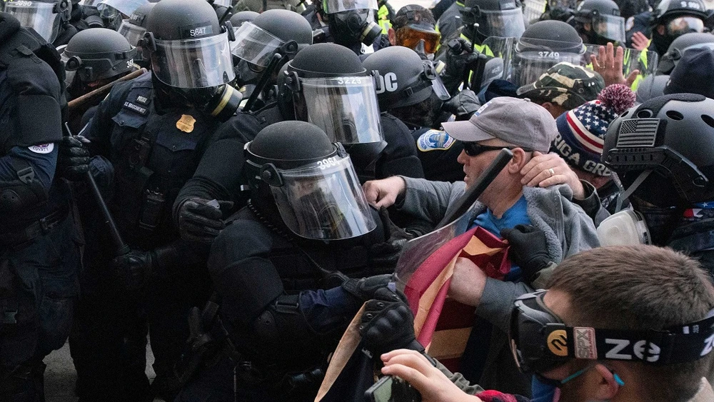 Người biểu tình đụng độ với cảnh sát khi cố gắng xông vào đập phá Điện Capitol hôm 6-1. Ảnh: AP