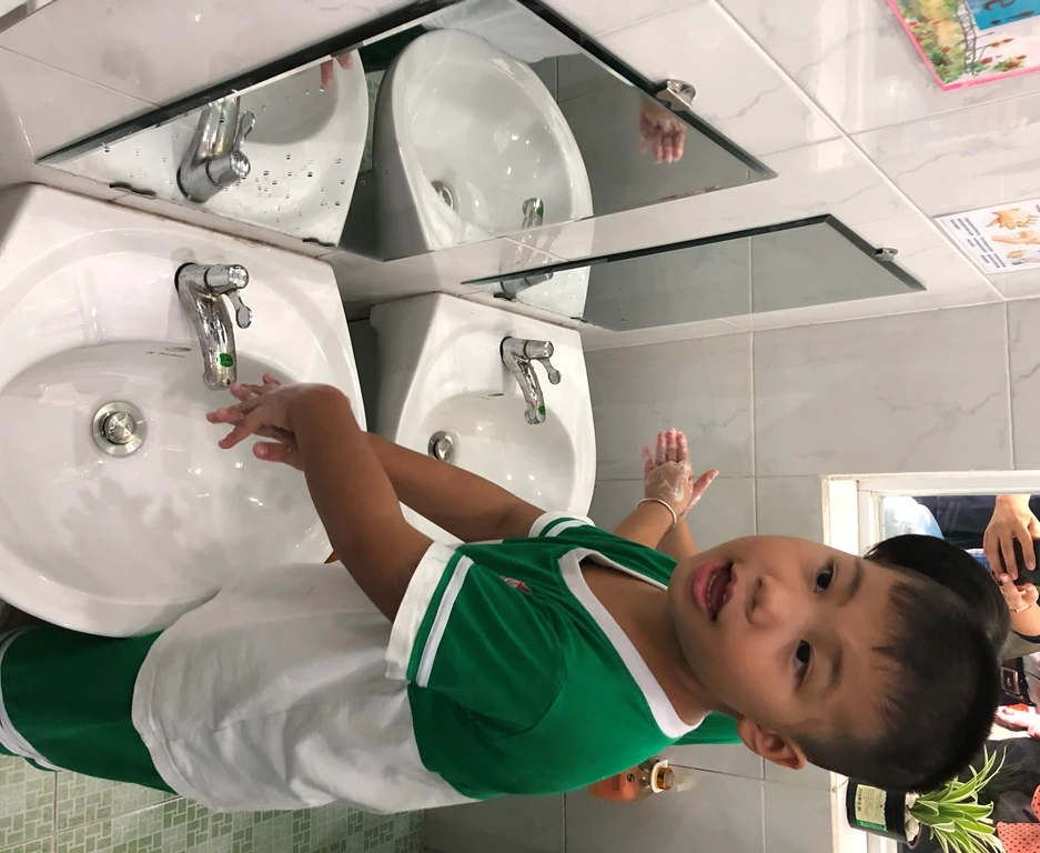Học sinh Trường mầm non Hoàng Yến (quận Thủ Đức) thực hiện rửa tay phòng dịch bệnh truyền nhiễm. Ảnh: HL