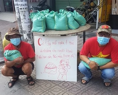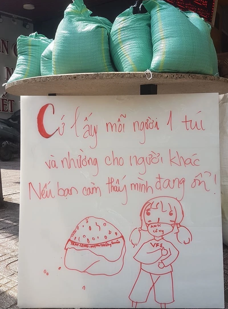 Từ sáng sớm ngày 2-4, một vài anh chị em VFS đã tất bật tự tay chia một tấn gạo ra những bao nhỏ để gửi đến người dân gặp khó trong mùa dịch COVID-19. Con gái anh Phạm Tiến mới học lớp 5 còn nắn nót viết dòng chữ "Cứ lấy mỗi người một túi và nhường cho người khác nếu bạn cảm thấy mình đang ổn", rồi còn vẽ tấm hình cô gái "Anti Cô Vy" thật ngộ nghĩnh bên cạnh túi gạo nghĩa tình của một mạnh thường quân xin giấu tên ủng hộ gạo.
