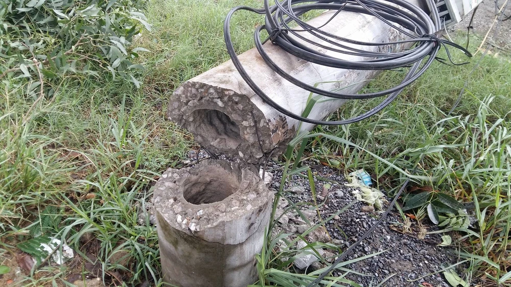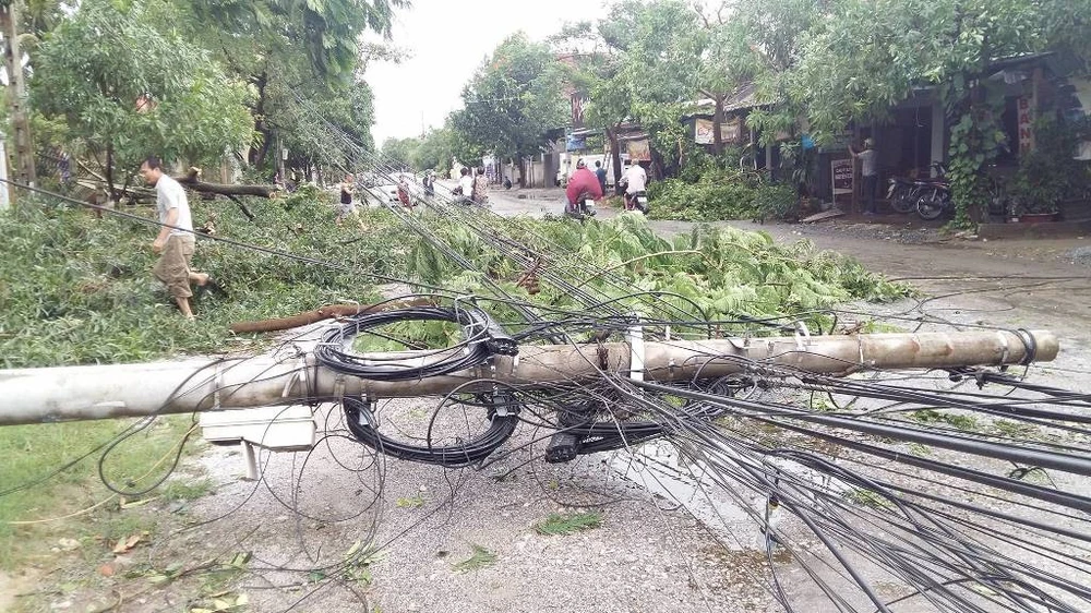 Một trụ điện bị bão quật ngã.
