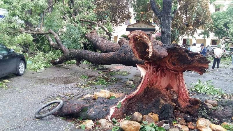Nhiều cây cổ thụ lớn ngã đổ chắn ngang đường.