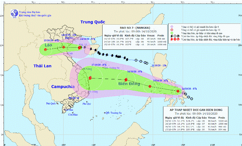 Đến 19 giờ ngày 14-10, vị trí tâm ATNĐ ở trên đất liền các tỉnh Thanh Hóa, Nghệ An. Sức gió mạnh nhất vùng gần tâm ATNĐ mạnh cấp 6 (40-60km/giờ), giật cấp 8. Bán kính gió mạnh từ cấp 6, giật từ cấp 8 trở lên khoảng 50km tính từ tâm ATNĐ.