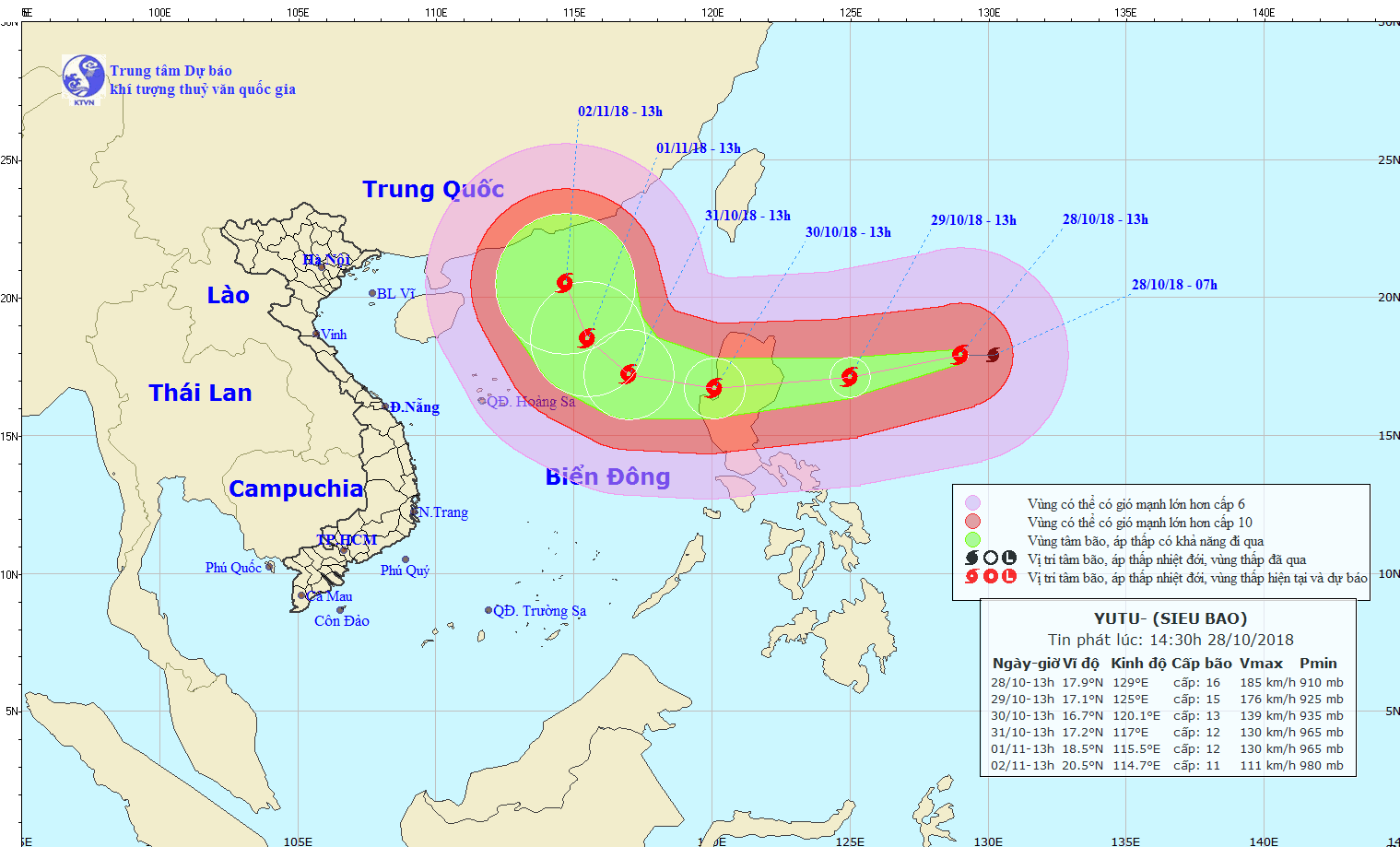 Trung tâm Dự báo Khí tượng Thủy văn Trung ương cho biết hồi 13 giờ ngày 28-10, vị trí tâm siêu bão, cách đảo Lu-Dông (Philippines) khoảng 730 km về phía Đông. Sức gió mạnh nhất vùng gần tâm siêu bão mạnh cấp 16, giật trên cấp 17.