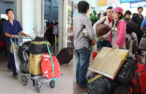 Dịch vụ xe đẩy hành lý ở Ga Sài Gòn (ảnh trái). Với số hành lý này, nếu không có xe đẩy thì khách chỉ còn biết khóc. Ảnh: HỒNG TRÂM