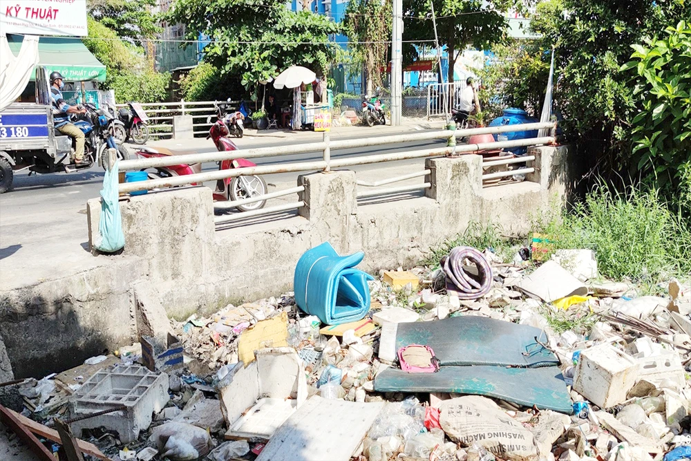 Rác thải từ vật dụng gia đình đã qua sử dụng, thùng xốp xả đầy mặt kênh Hy Vọng. Ảnh: NGUYỄN HIỀN
