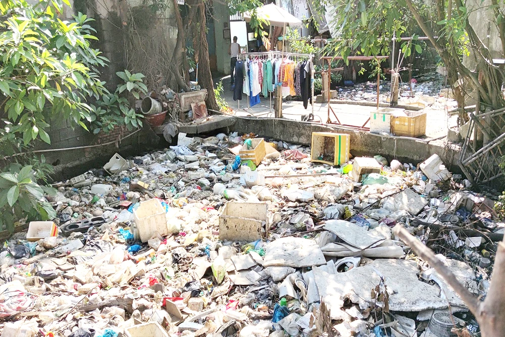 Rác thải tràn mặt kênh, mấp mé sân nhà người dân sống dọc kênh Hy Vọng. Ảnh: NGUYỄN HIỀN