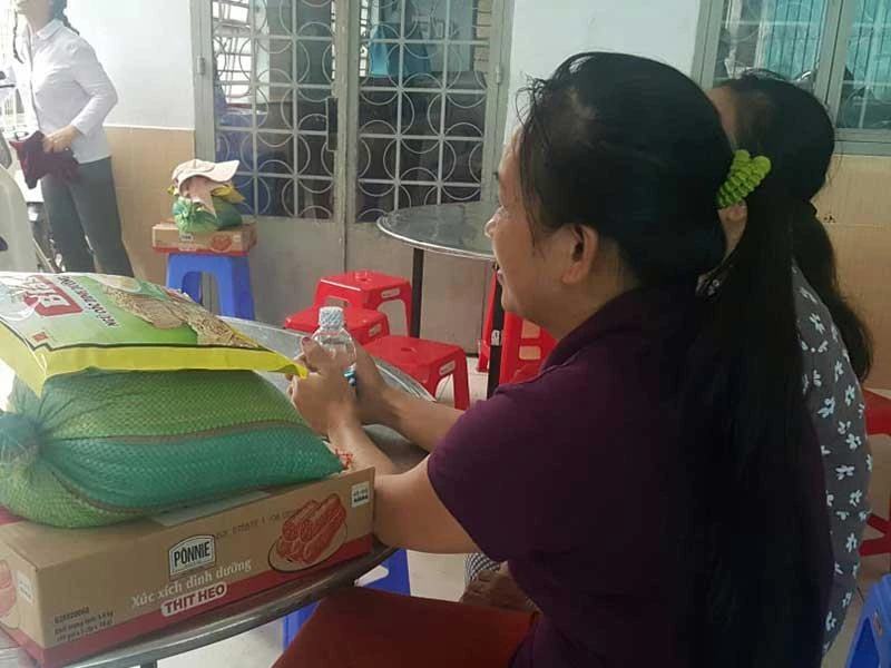 Chị NTNB nhận quà hỗ trợ gia đình khó khăn tại lớp học tình thương dành cho con chị ở quận Bình Tân (TP.HCM) mới đây. Ảnh: H.MINH