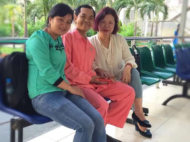 Nhà báo Vĩnh Quyên, Truyền hình Quốc hội Việt Nam (bìa phải), đã đến thăm và động viên nhà báo Hữu Bằng trước lúc vào khám để quyết định mổ tại BV Chợ Rẫy. Ảnh: VQ
