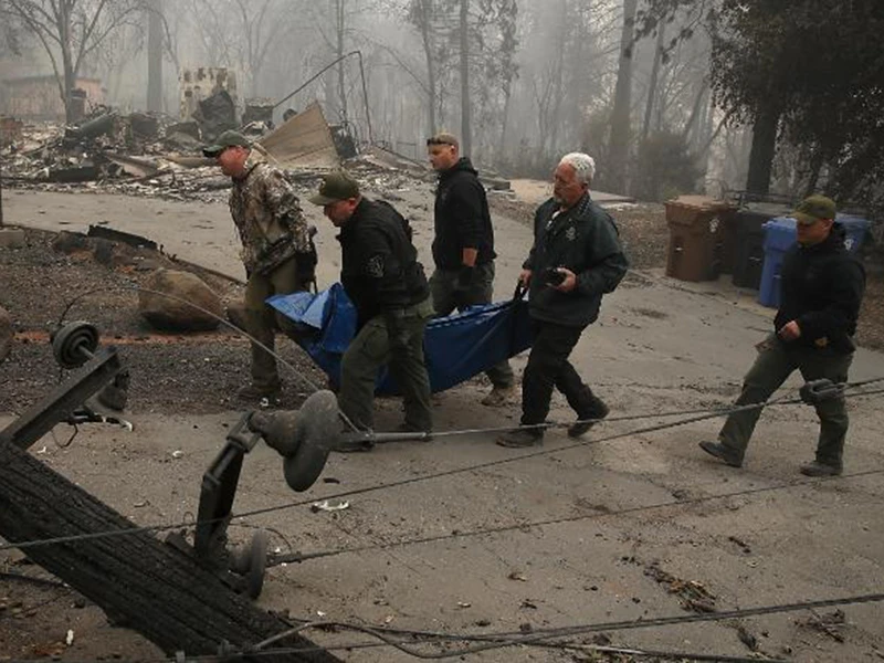 Cảnh sát thu thập thi thể nạn nhân chết trong cháy rừng ở thị trấn Paradise, quận Butte, bang California (Mỹ) ngày 10-11. Ảnh: CNN