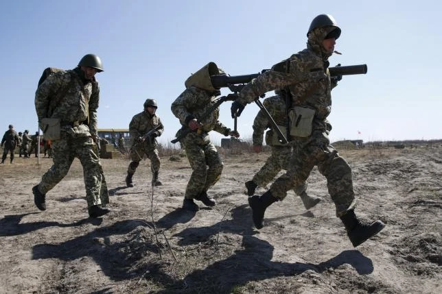 Lính nhảy dù Ukraine mang súng trường chống tăng trong một buổi diễn tập gần Zhytomyr ngày 9-4 (Nguồn: Reuters)