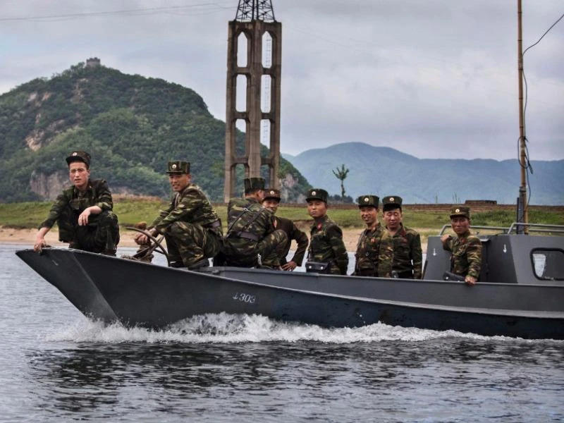 Các binh sĩ Triều Tiên trên một chiếc tàu chạy ngang sông Yalu giáp với TP biên giới Đan Đông thuộc tỉnh Liêu Ninh của Trung Quốc. Ảnh: GETTY