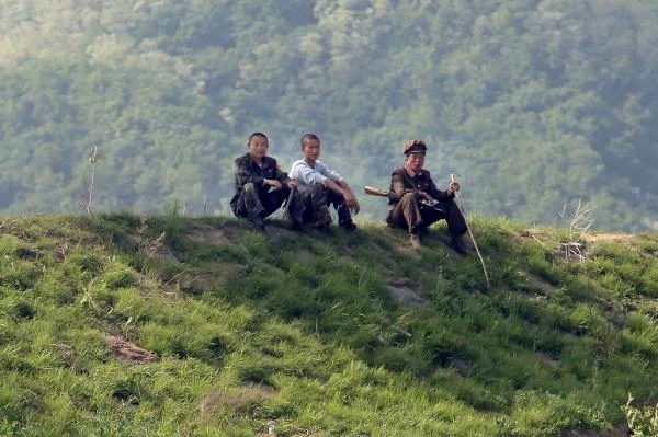 Các binh sĩ Triều Tiên đang ngồi gần khu vực biên giới giáp thành phố Đan Đông của Trung Quốc. Ảnh: UPI