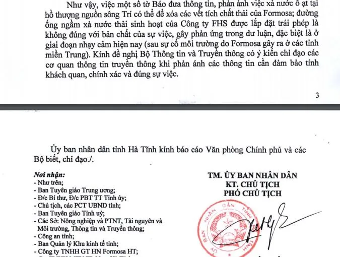 Theo Công văn số 3353 về việc báo cáo kết quả kiểm tra, xử lý thông tin báo nêu của UBND tỉnh Hà Tĩnh (ký ngày 19-7): Báo điện tử Người Đưa Tin và một số báo có đăng các bài phản ánh việc xả thải nước ồ ạt tại hồ thượng nguồn sông Trí có thể để xóa các vết tích chất thải của Formosa và đường ống xả thải nước sinh hoạt của Formosa lắp đặt trái phép là không đúng với bản chất sự việc. Việc đưa tin không đúng bản chất sự việc gây phản ứng trong dư luận, đặc biệt là ở giai đoạn nhạy cảm hiện nay (sau sự cố môi trường do Formosa gây ra ở các tỉnh miền Trung).