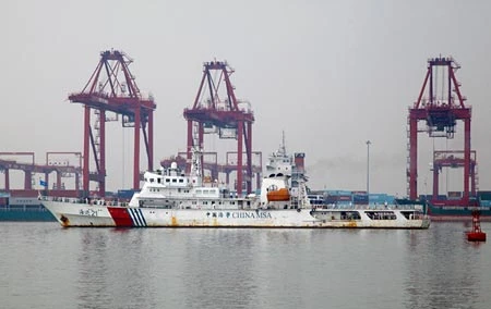 Tàu cảnh sát biển Trung Quốc trên đảo Phú Lâm thuộc quần đảo Hoàng Sa của Việt Nam. Ảnh được chụp ngày 9/10. Nguồn: Tân Hoa Xã.