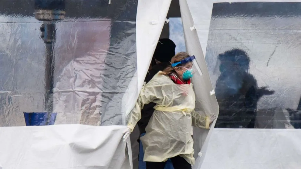Một chuyên gia y tế đi ra từ khu vực xét nghiệm COVID-91 theo quy trình "drive-thru" ở Đại học Dayton, bang Ohio (Mỹ) hôm 17-3. Ảnh: GETTY IMAGES