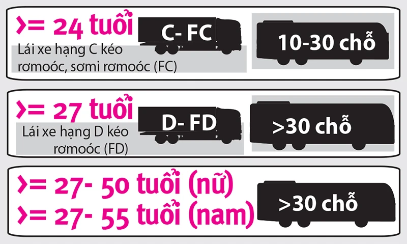 - Người đủ 24 tuổi trở lên được lái ô tô chở người từ 10 đến 30 chỗ ngồi; lái xe hạng C kéo rơmoóc, sơmi rơmoóc (FC);