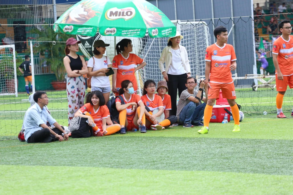 | Các cầu thủ nữ báo Pháp Luật TP.HCM không ngại trời nắng cổ vũ cho đội nam. |