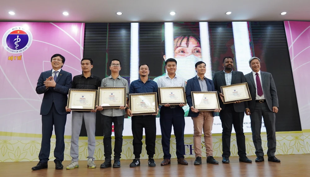 Thứ trưởng Bộ Y tế Nguyễn Trường Sơn (bìa phải) và Phó Chủ tịch thường trực Hội Nhà báo Việt Nam Hồ Quang Lợi (bìa trái) trao giải cho các tác phẩm đoạt giải A. Ảnh: PHẠM NGUYỄN