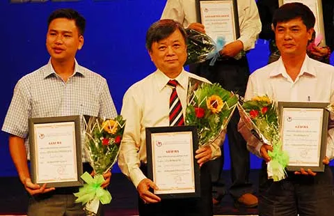 Luật sư Trương Trọng Nghĩa (phải) nhận giải ba bài chính luận và đại diện báo Pháp Luật TP.HCM nhận giải ba loạt bài tập thể. Ảnh: HTD