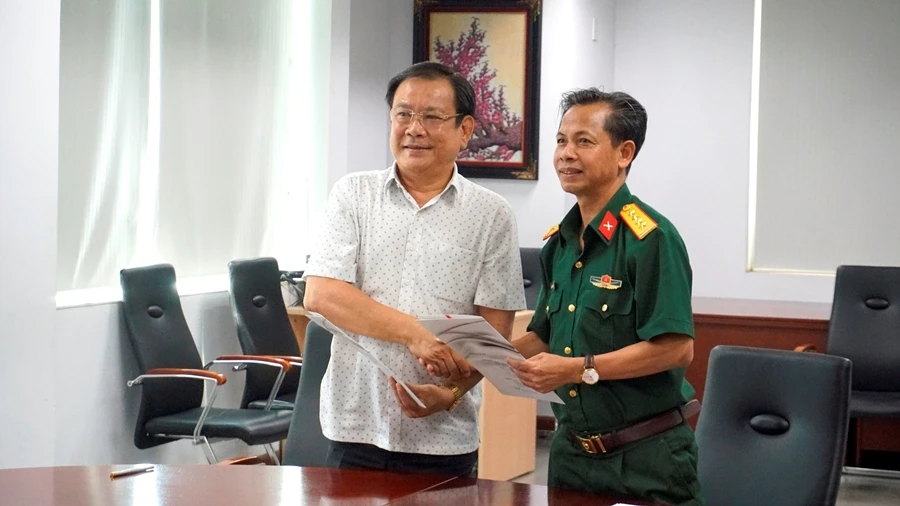 Ông Mai Ngọc Phước, Tổng Biên Tập Báo Pháp Luật TP.HCM (trái) và Đại tá Nguyễn Văn Bắc, Tổng Biên Tập Báo Quân Khu 7 ký biên bản ghi nhớ. Ảnh: QUANG DUY.