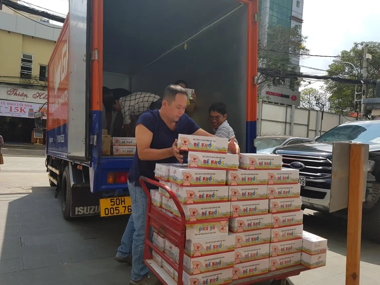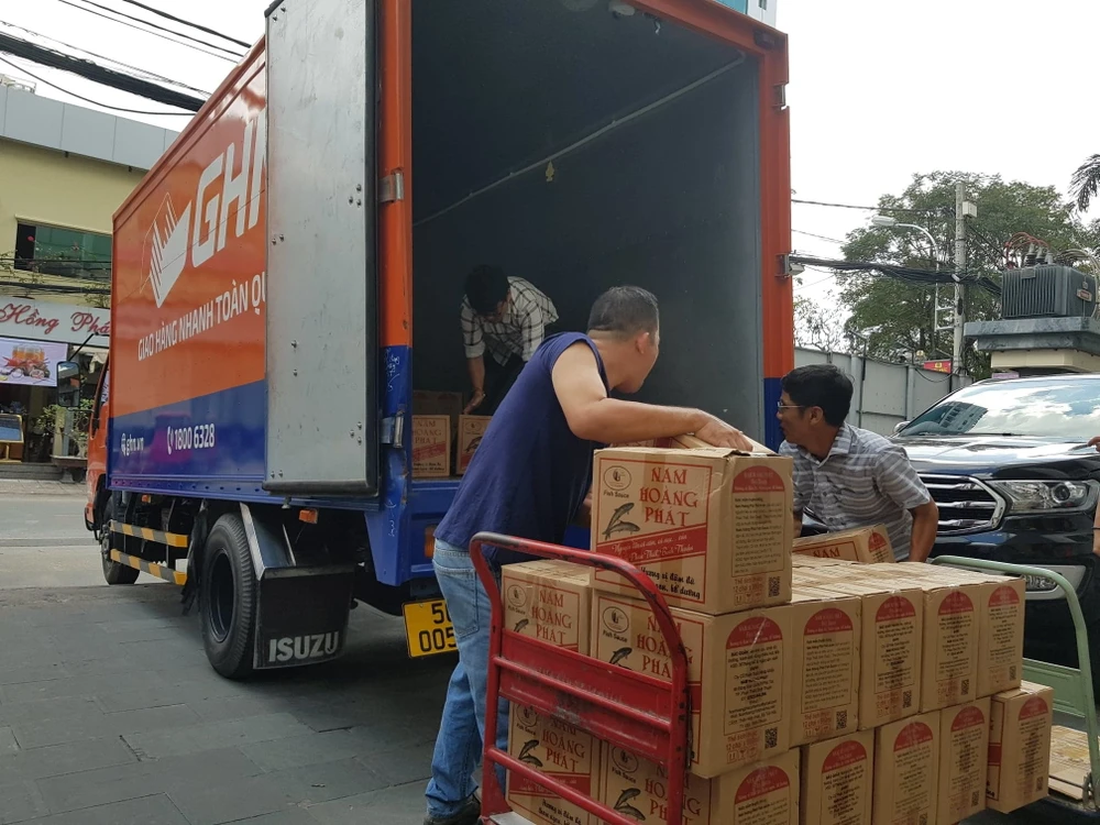 Hàng vận chuyển từ TP.HCM ra miền Trung đợt này gồm 500kg xúc xích ăn liền của Công ty Anco Family Food, 1.200 lít nước mắm truyền thống Phan Thiết Nam Hoàng Phát, 200 hũ ruốc thịt xào của Công ty Cổ phần Thực phẩm Thịnh Đại Phú. Ảnh: TM