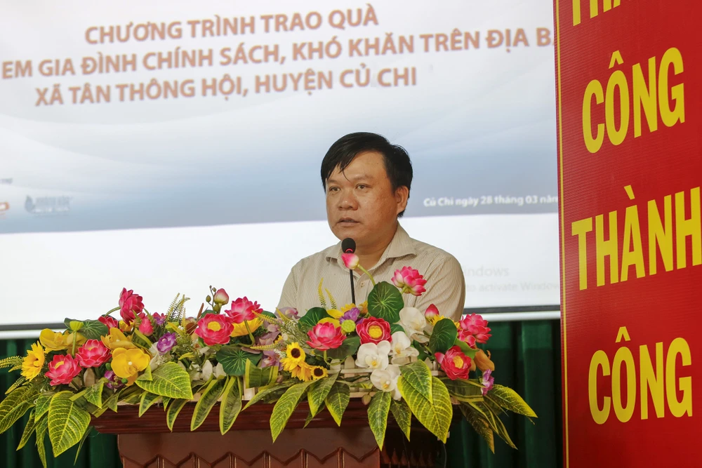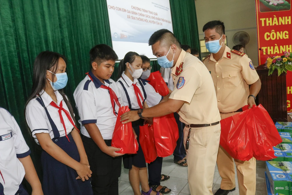 Nhằm quan tâm, hỗ trợ, chăm lo đời sống và học tập cho con em gia đình chính sách, khó khăn trên địa bàn xã Tân Thông Hội, huyện Củ Chi, TP.HCM, sáng 28-3, Báo Pháp Luật TP.HCM đã phối hợp với Đoàn TNCS Phòng CSGT đường sắt - đường bộ Công an TP.HCM tổ chức trao quà cho 100 học sinh tại địa phương này. Mỗi phần quà bao gồm các nhu yếu phẩm trị giá hơn 500 ngàn đồng.