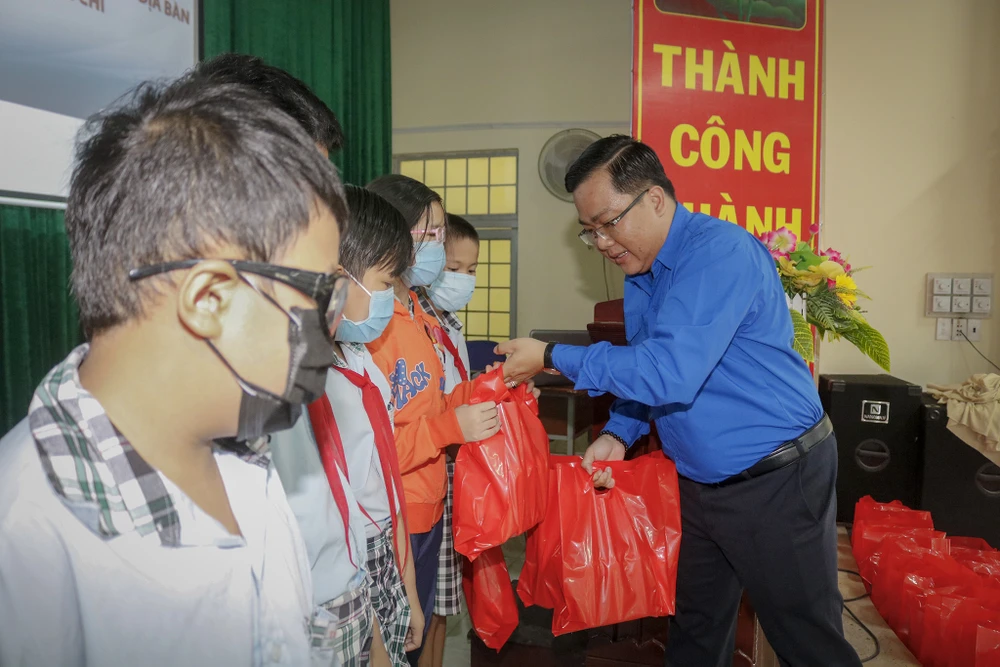 Đại diện báo Pháp Luật TP.HCM trao quà cho con em gia đình chính sách. Dịp này, có hơn 100 phần quà, mỗi phần trị giá hơn 500 ngàn đồng được trao đến các em.